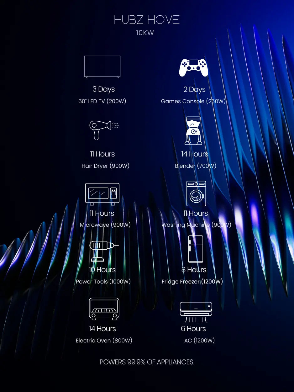 Enjoy energy independence both on and off the grid, with a continuous supply of solar energy to power your home. Take charge of rising electricity expenses knowing that hubz Home SL is built to last 10 years of daily use, featuring Pro Series LiFePO4 storage, advanced MPPT technology, and a robust Battery Management System (BMS).