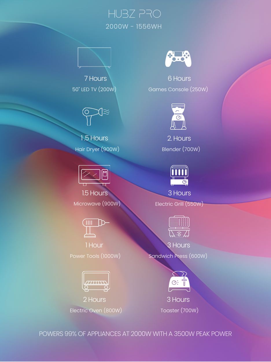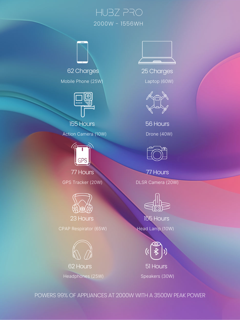 hubz One, portable solar power for 99.9% of all your gear and appliances.