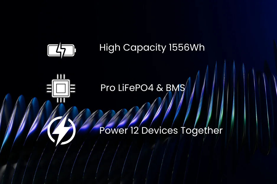 High Capacity 1556Wh 2000W LifePO4 storage with Pro BMS can power 12 devices together.